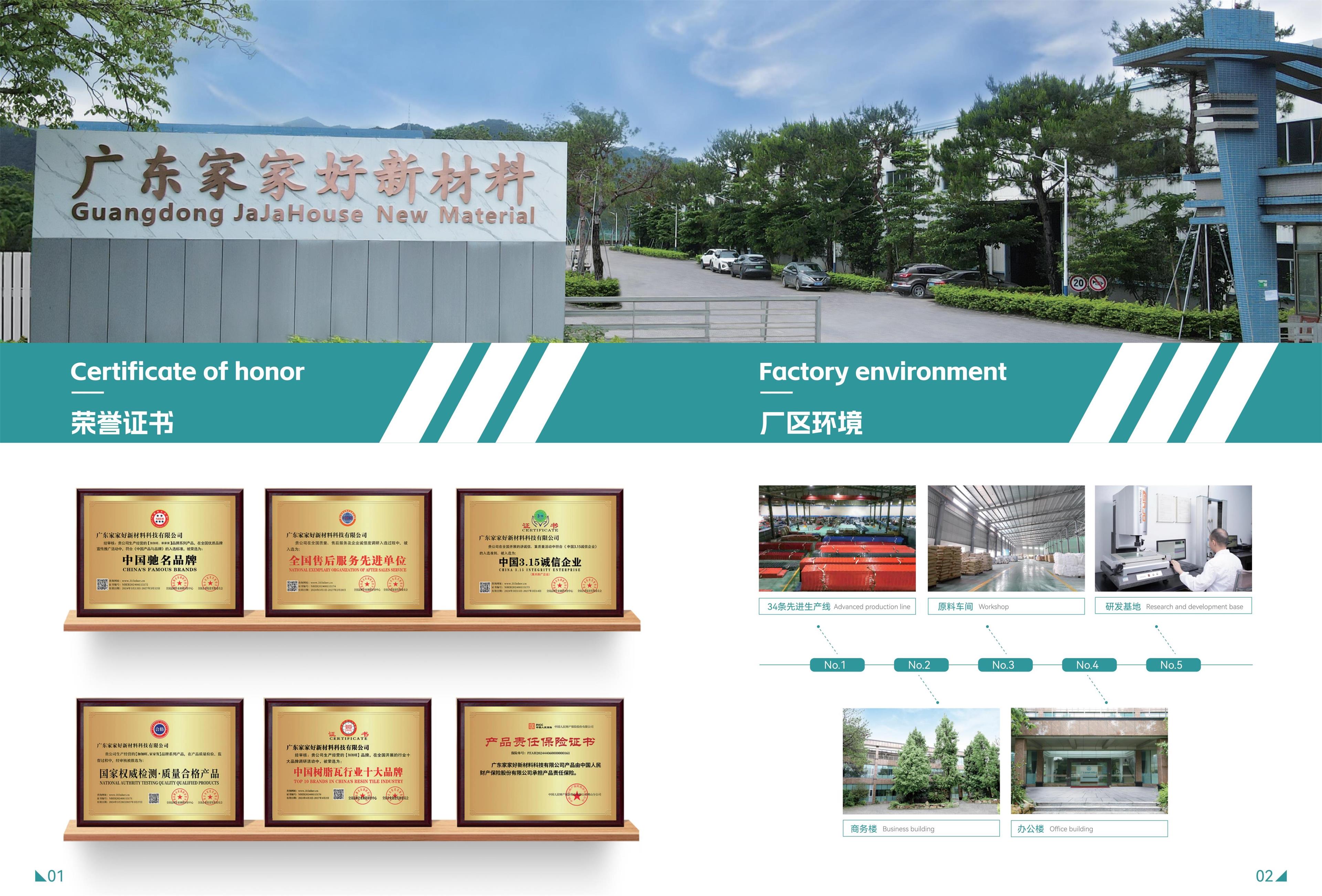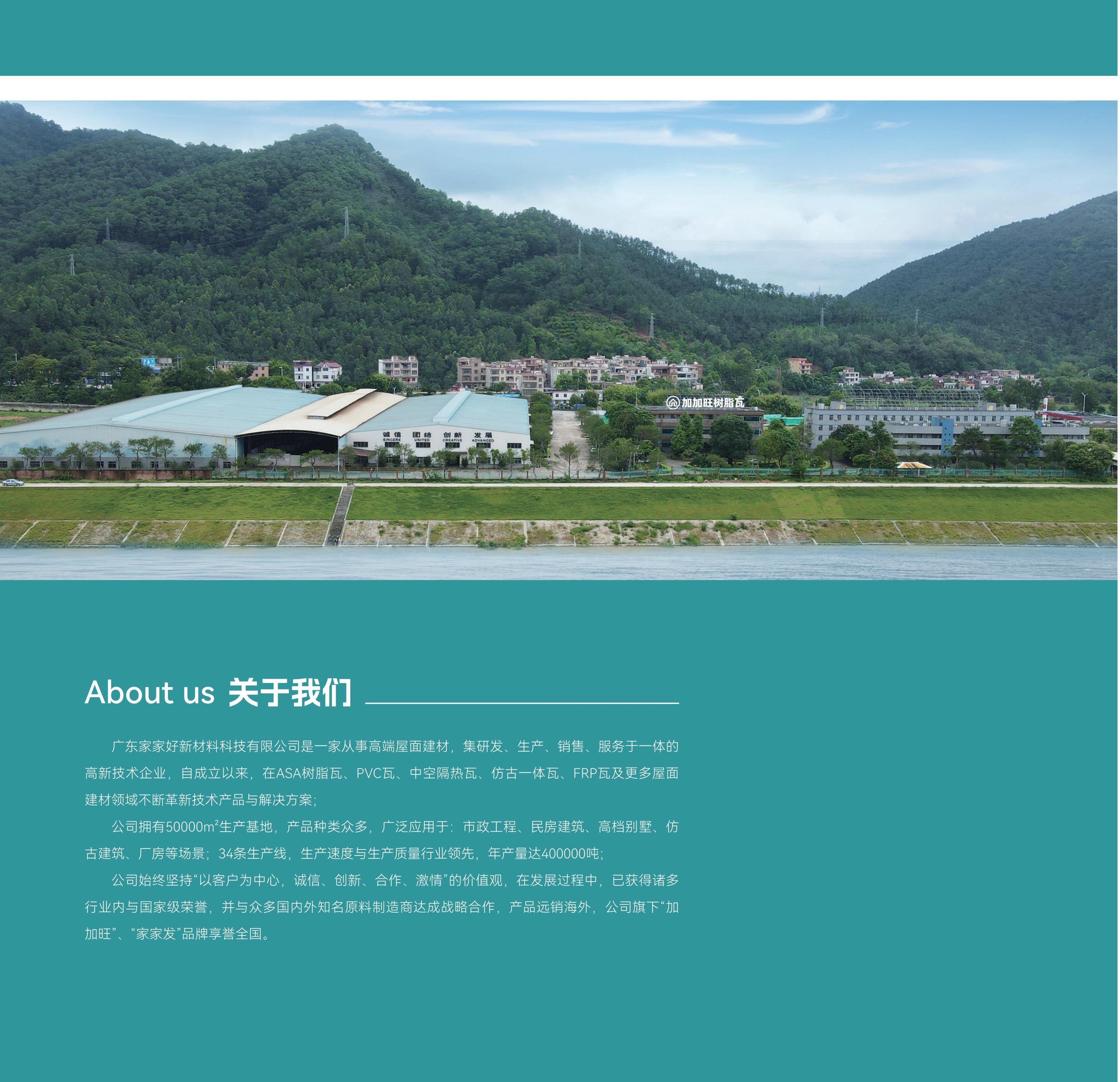 广东家家好新材料科技有限公司是一家从事高端屋面建材,集研发、生产、销售、服务于一体的高新技术企业,自成立以来,在ASA树脂瓦、PVC瓦、中空隔热瓦、仿古一体瓦、FRP瓦及更多屋面建材领域不断革新技术产品与解决方案: